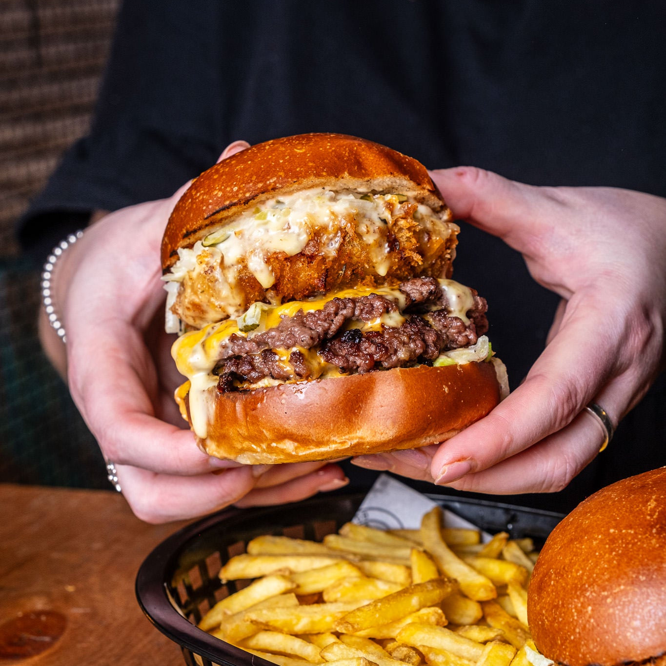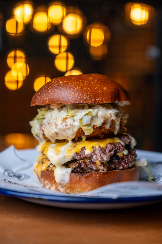 Double fried chicken thighs stacked high with maple bacon, cheese sauce, BBQ, onion rings, and crunch.